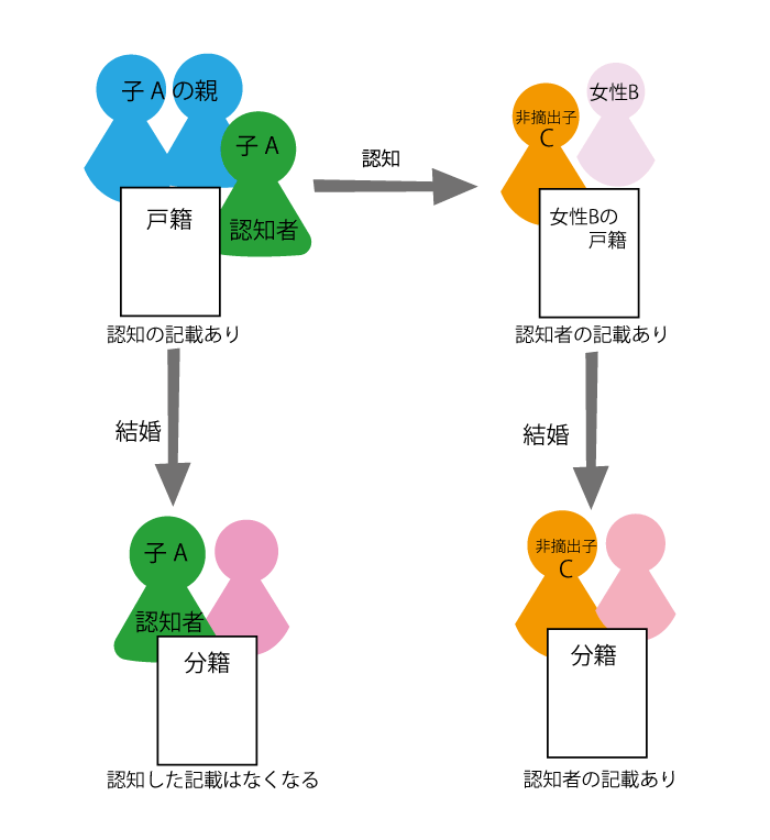 しかし、後に、子Aが別の女性と結婚し、分籍して新しく戸籍を作った場合に非嫡出子Cを認知した事項は引き継がれません。
