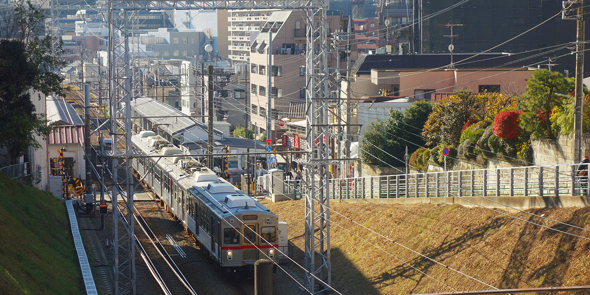 東急池上線の石川台駅は東京都大田区にあります。この地域は坂道が多く、駅前の線路沿いの坂道から駅を見下ろす風景はテレビCMやドラマのロケでもしばしば使われています。映画『東京物語』など数々の名作で知られる小津安二郎監督も作品の中で、石川台駅のホームを撮っているそうです。駅の近くには石川台希望ヶ丘商店街があり、風情のあるお店が軒を連ねています。