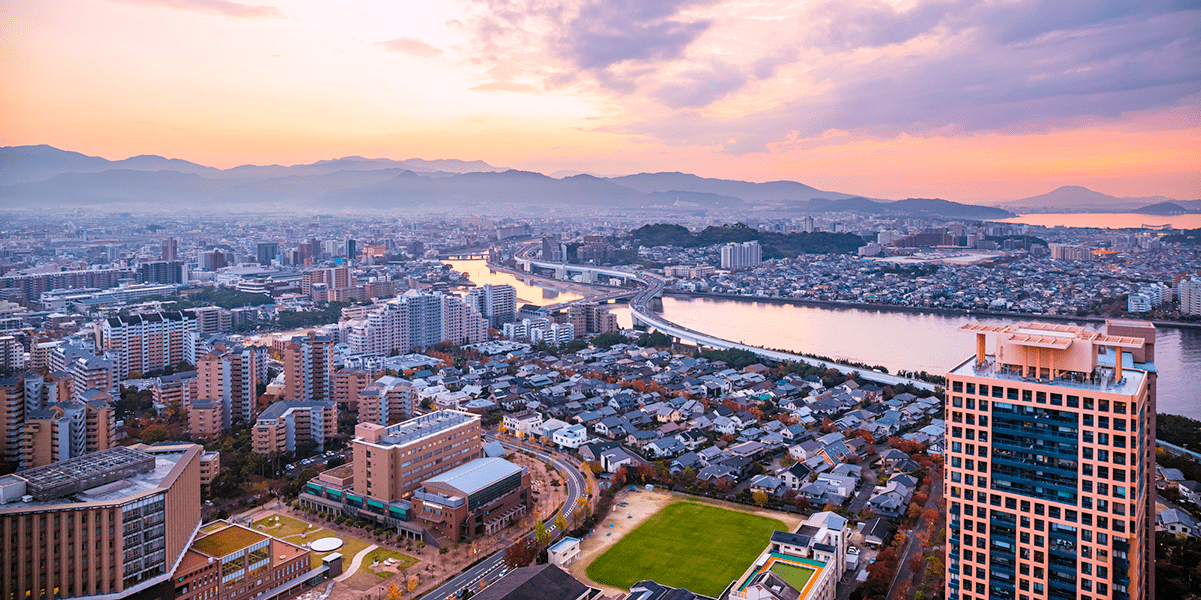 福岡県の県庁所在地である福岡市は、九州本島北部に位置しています。福岡市の東区・博多区周辺を沿岸とする玄界灘は、対馬海流の流れる博多湾に面しており水産業がさかんです。シーサイドももち地区(福岡市早良区)にある「福岡タワー」は全長200mを超え、日本で最も高い海浜タワーとして知られています。もつ鍋、水炊き鍋、博多うどん、麺の硬さを選べる博多ラーメンなどの福岡グルメは人気が高く、市内には100軒以上の屋台が出店されています。