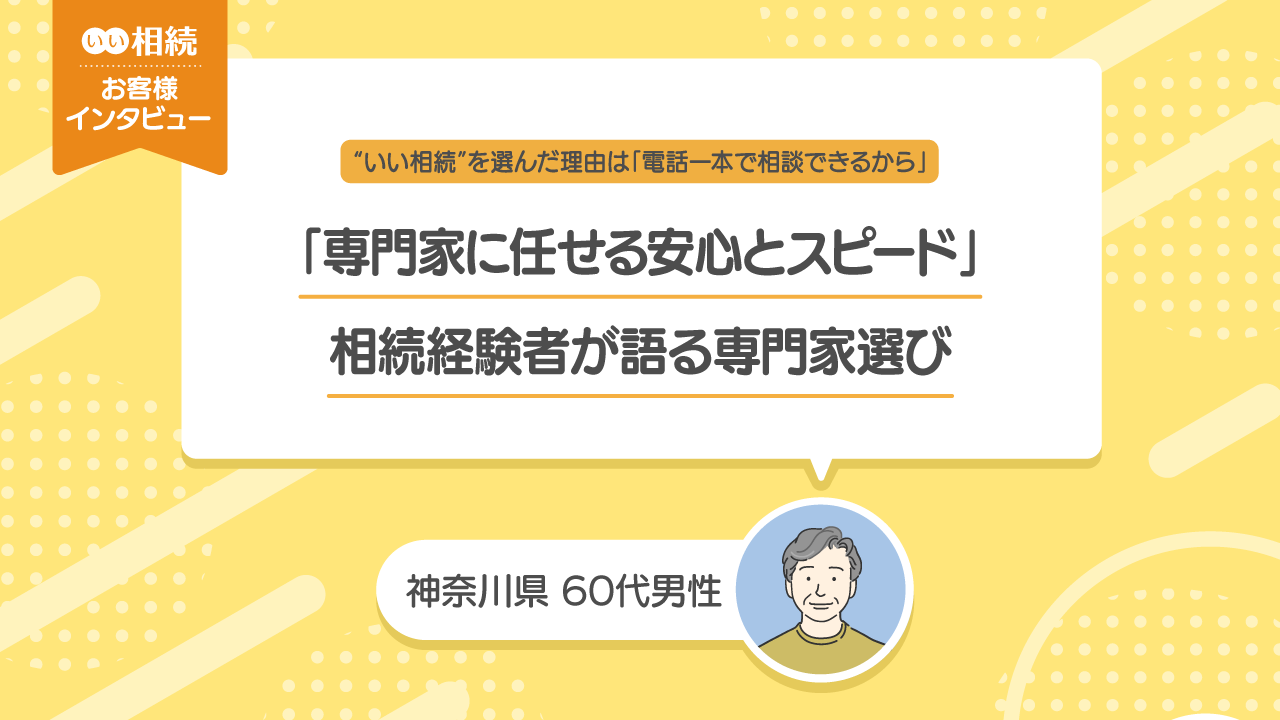 「いい相続(姉妹サイト:e行政書士、e税理士等を含む)」をご利用いただいた方へのインタビュー。 相続手続きを依頼できる専門家を探していたご相談者様(神奈川県/60代男性)。 どのようなお困りごとがあったのかをお話しいただきました。 今回は専門家に頼むと決めていた ―どなたがお亡くなりになりましたか。 妻です。9月に亡くなりました。 ―急なことだっ……