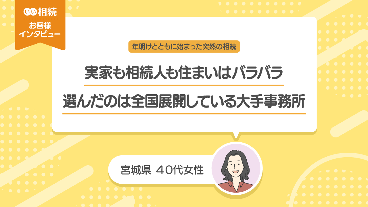 「いい相続(姉妹サイト:e行政書士、e税理士等を含む)」をご利用いただいた方へのインタビュー。 相続税申告を依頼できる税理士を探していたご相談者様(福島県/40代女性)。 どのようなお困りごとがあったのかをお話しいただきました。 年明けとともに始まった突然の相続 ――どなたがお亡くなりになったのでしょうか。 私の父です。亡くなったのは今年の1月の初……