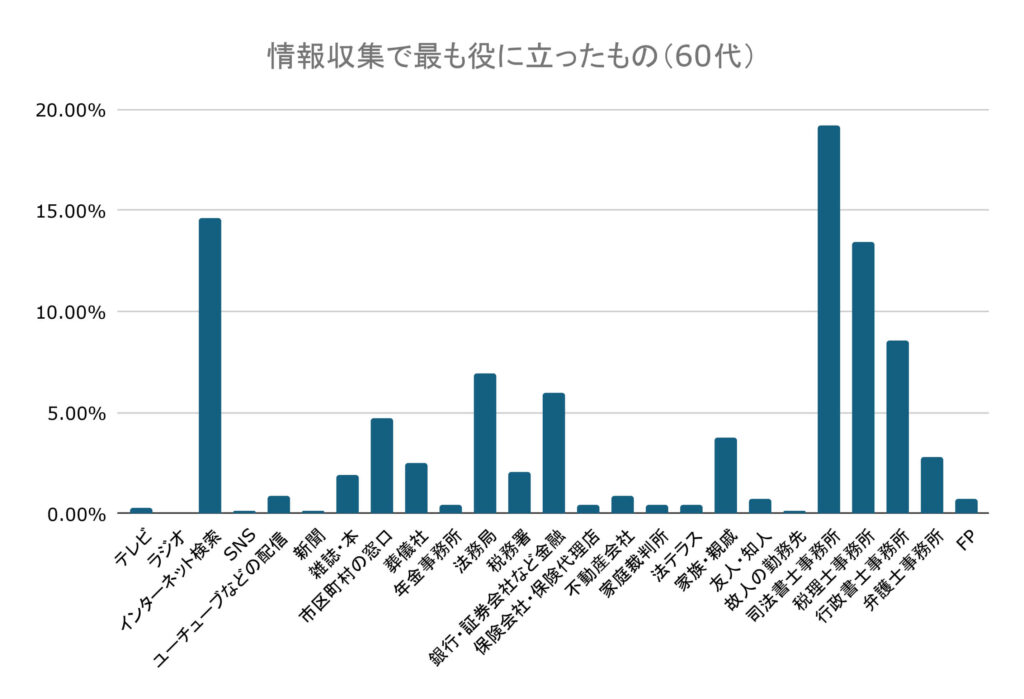 60代の相続の情報収集については、士業の事務所や法務局、金融機関などに直接訪れる人が多いことがわかります。