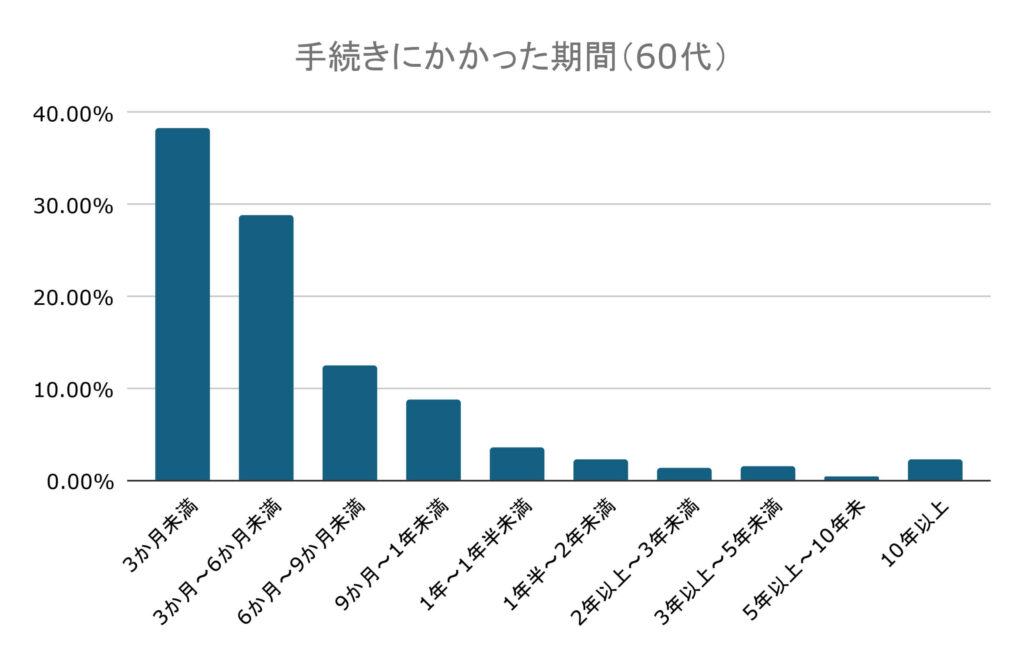 その一方、1年~1年半未満が3.59%、1年半~2年未満が2.21%、2年以上~3年未満が1.38%、3年以上~5年未満が1.52%と、少数ではあるものの手続きが長期間にわたる場合も見られます。