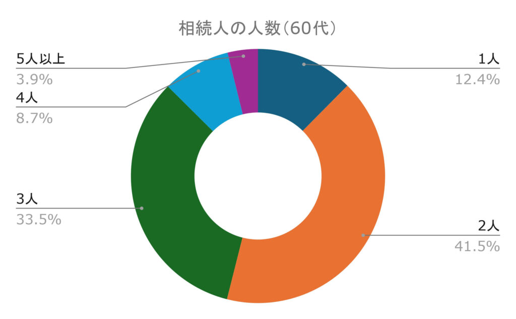 相続人2人と3人をあわせて75.03%と過半数を超えることから、60代の相続において相続人は2~3人が一般的だと言えます。