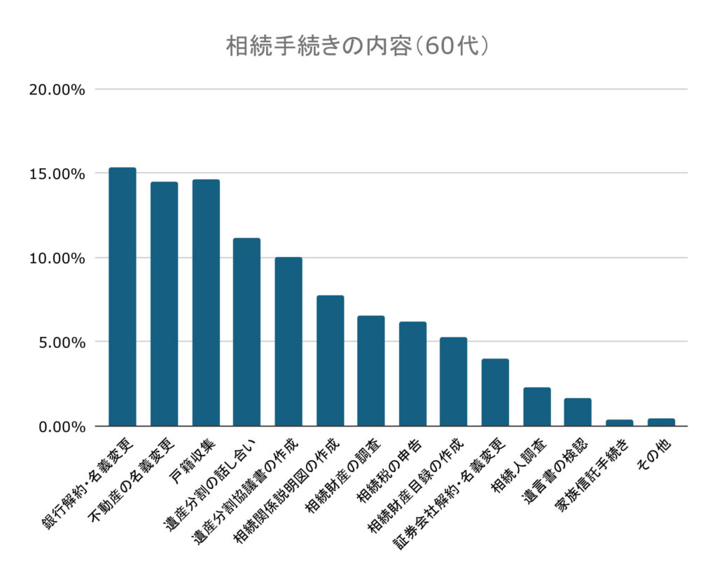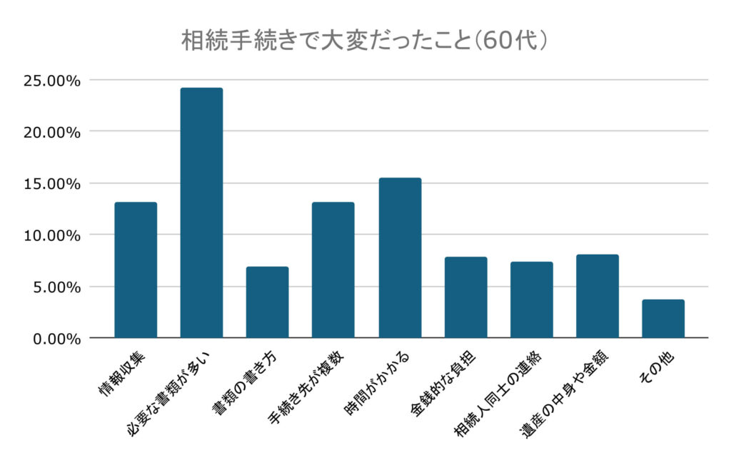 60代の相続で大変だったことという質問では、「必要な書類が多い」が24.21%と最多となりました。また「時間がかかる」が15.54%、「情報収集」「手続き先が複数」が13.16%と続きます。