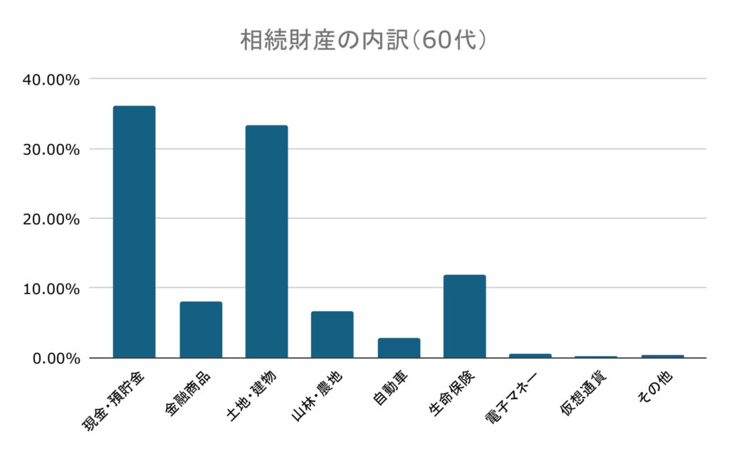 60代の相続の相続財産内訳は現金・預貯金が36.13%と最多、次いで土地・建物が33.44%でした。