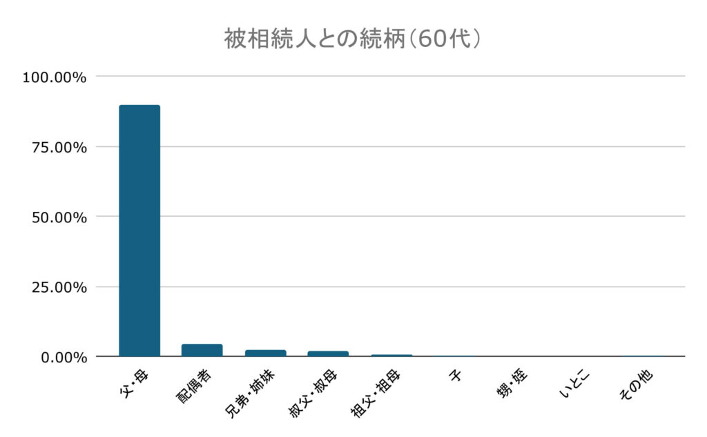 60代の相続について、被相続人(亡くなった人)との続柄は、父・母が他より圧倒的に多く89.94%でした。父母の相続が大多数であることがわかります。