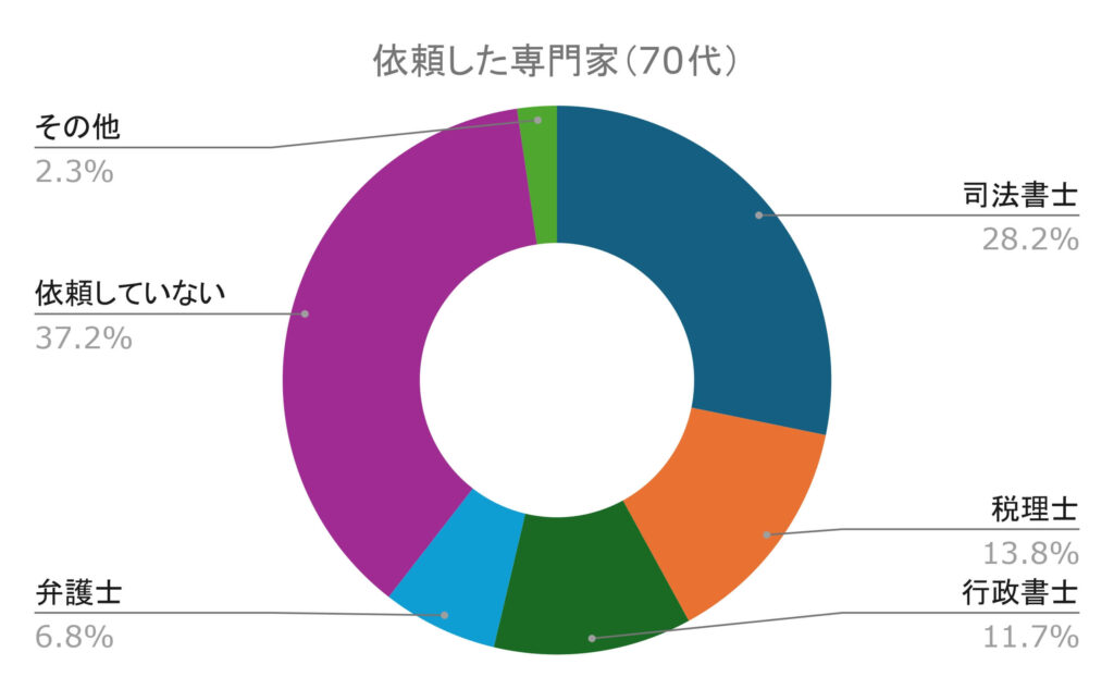 その一方、専門家に依頼していない割合は37.16%でした。したがって70代の63%程が専門家に相続手続きを依頼したと言えます。