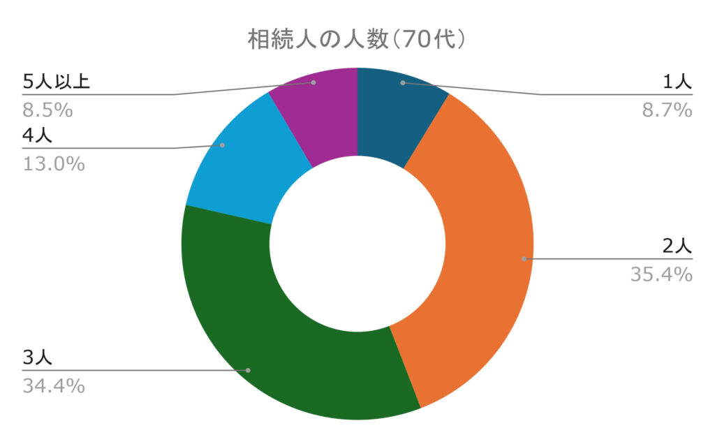 相続人3人と2人をあわせて69.82%と過半数を超えることから、70代の相続において相続人は2~3人が一般的だと言えます。