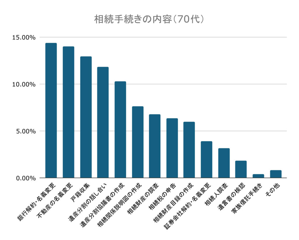 また70代の相続は、父・母の相続の割合も高いものの、配偶者の相続手続きをおこなう割合も他の年代より増えていることがわかりました。