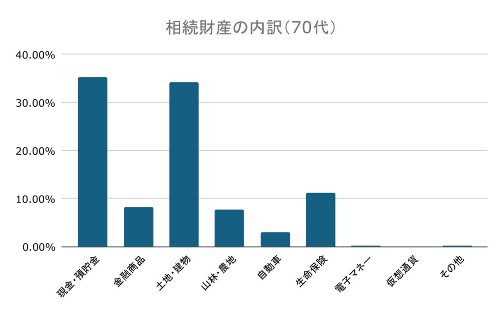70代の相続の相続財産内訳は現金・預貯金が35.31%と最多、次いで土地・建物が34.19%でした。