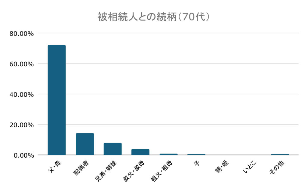 70代の相続について、被相続人(亡くなった人)との続柄は、父・母が他より圧倒的に多く72.07%でした。父母の相続が大多数であることがわかります。