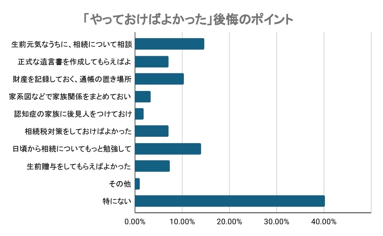 相続を経験した後「特に後悔はない」と答えた人が40.22%と最も多く、相続手続きが比較的円滑に進んだ、または納得できる形で終えられたと感じている人が多いことがうかがえます。