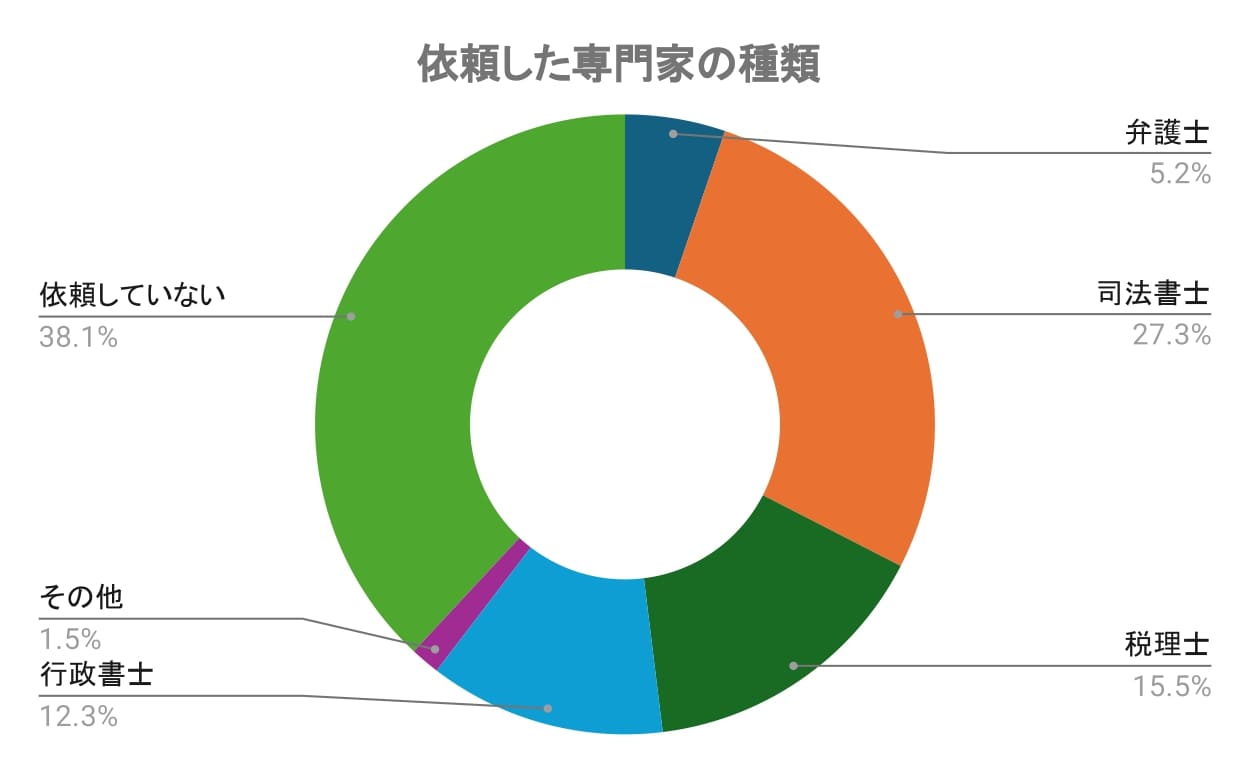 相続手続きで「専門家に依頼していない」と答えた人が全体の38.07%を占め、約4割の方が自力で手続きを行っていたことがわかりました。一方で、残りの6割以上は何らかの専門家に依頼していました。