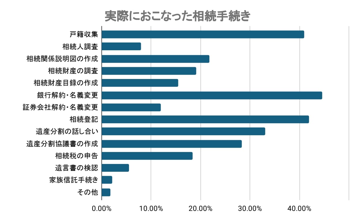 「遺産分割の話し合い」(33.03%)や「遺産分割協議書の作成」(28.28%)も比較的多く見られ、財産の分け方について相続人同士で話し合いで決める家族が多いことがわかります。また、「相続関係説明図の作成」(21.78%)や「相続財産の調査」(19.08%)、「相続財産目録の作成」(15.49%)など、手続きのための整理や準備も一定数を占めました。