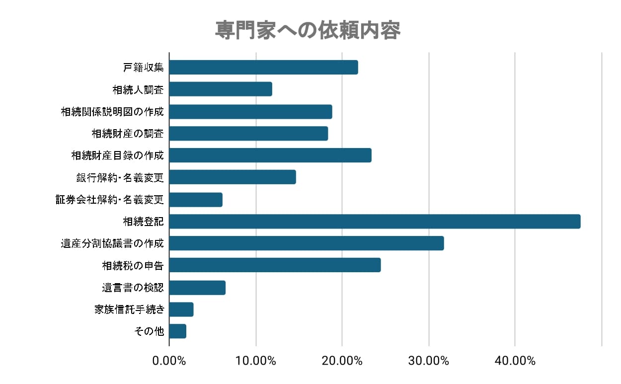 専門家に依頼した内容として最も多かったのは「相続登記」(47.60%)でした。不動産の名義変更は日頃身近な手続きではなく、専門的な知識が必要なことで、専門家のサポートを受けるケースが多いことがうかがえます。