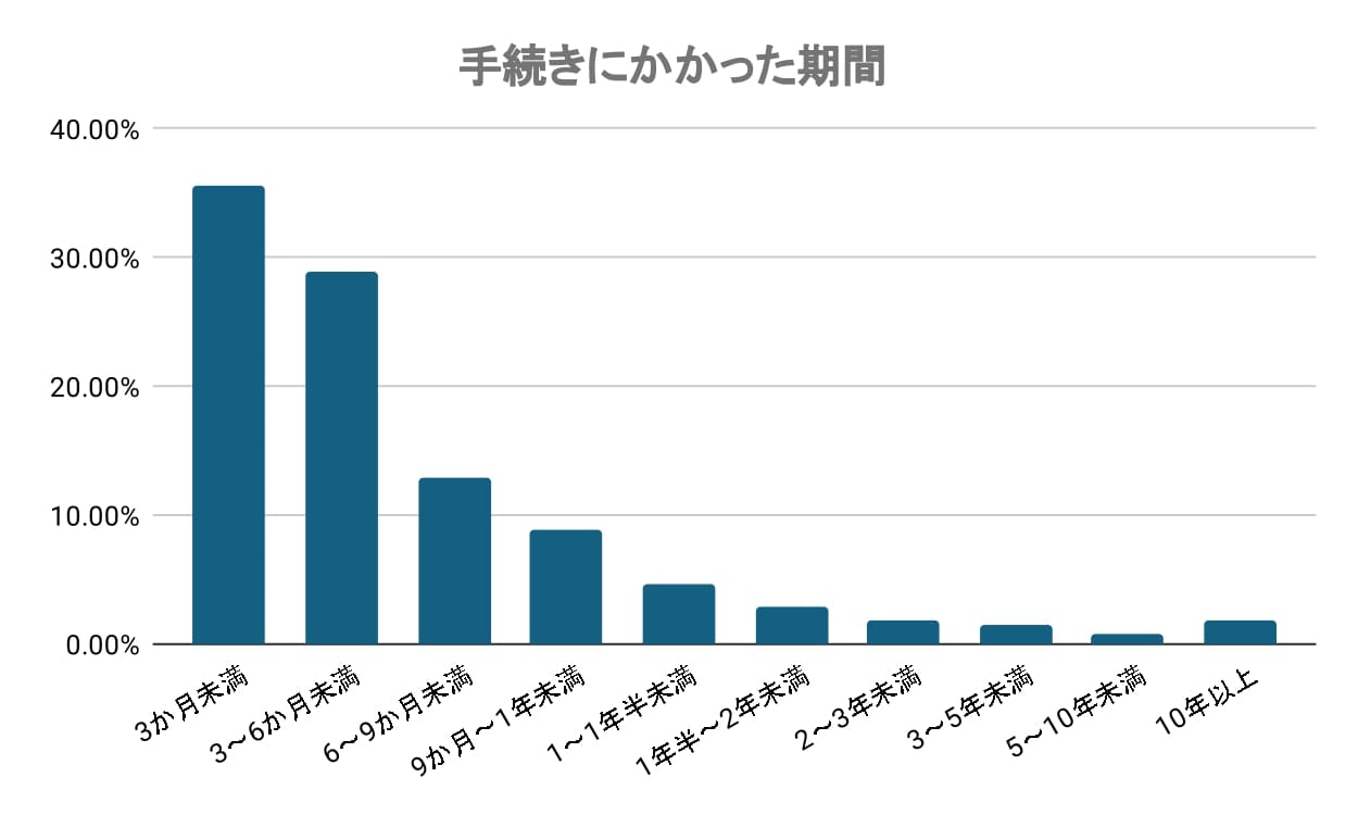 相続手続きにかかった期間は「3か月未満」が最も多く、全体の35.65%を占めていました。次いで「3~6か月未満」が28.86%と続いており、全体の6割以上が半年以内に手続きを終えていることがわかります。多くの方が比較的短期間で対応している実態がうかがえます。