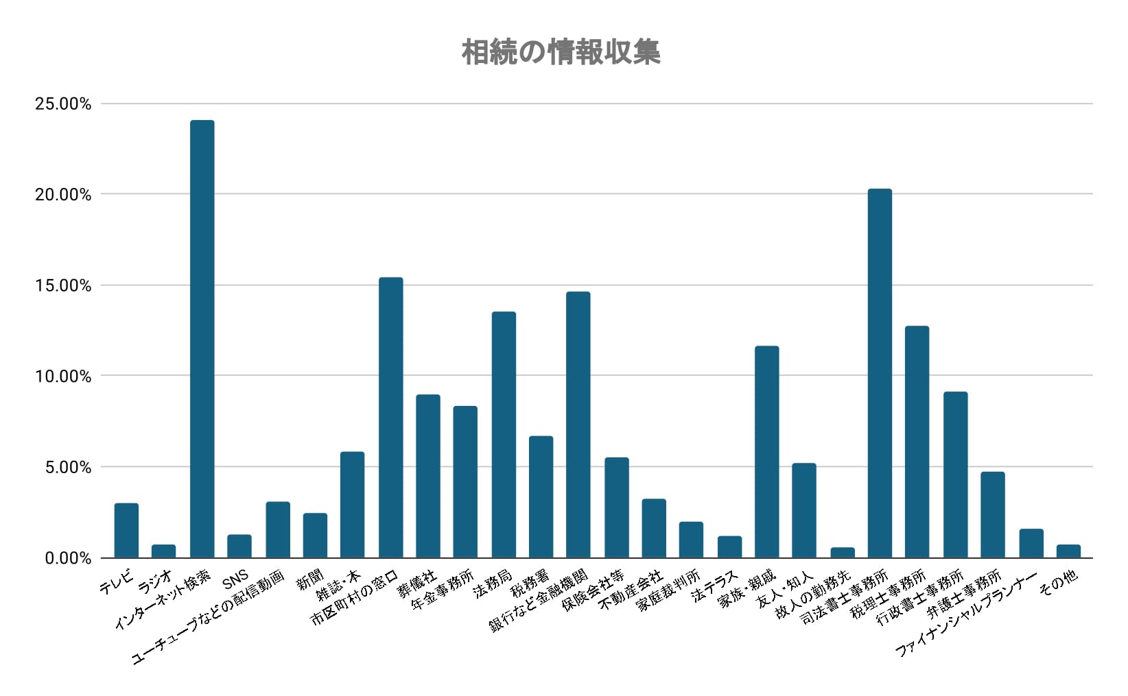 相続に関する情報を得た手段は多岐にわたり、最も多かったのは「インターネット検索」(24.09%)で、相続手続きに関する情報を自分で調べる人が多い傾向が見て取れます。次いで「司法書士事務所」(20.28%)、「市区町村の窓口」(15.40%)、「銀行など金融機関」(14.63%)、「法務局」(13.56%)など、公的機関や専門家への相談も一定の割合を占めています。