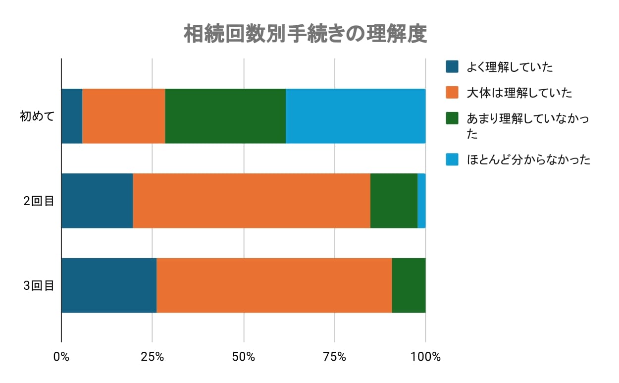 一方で、「あまり理解していなかった」と感じた人のうち81.29%が初回の相続経験者で、「ほとんど分からなかった」と答えた人も、そのほとんど(94.84%)が初めての相続でした。これに対して、2回目・3回目になるとこれらの回答は大きく減っており、3回目では「ほとんど分からなかった」という人はゼロでした。
