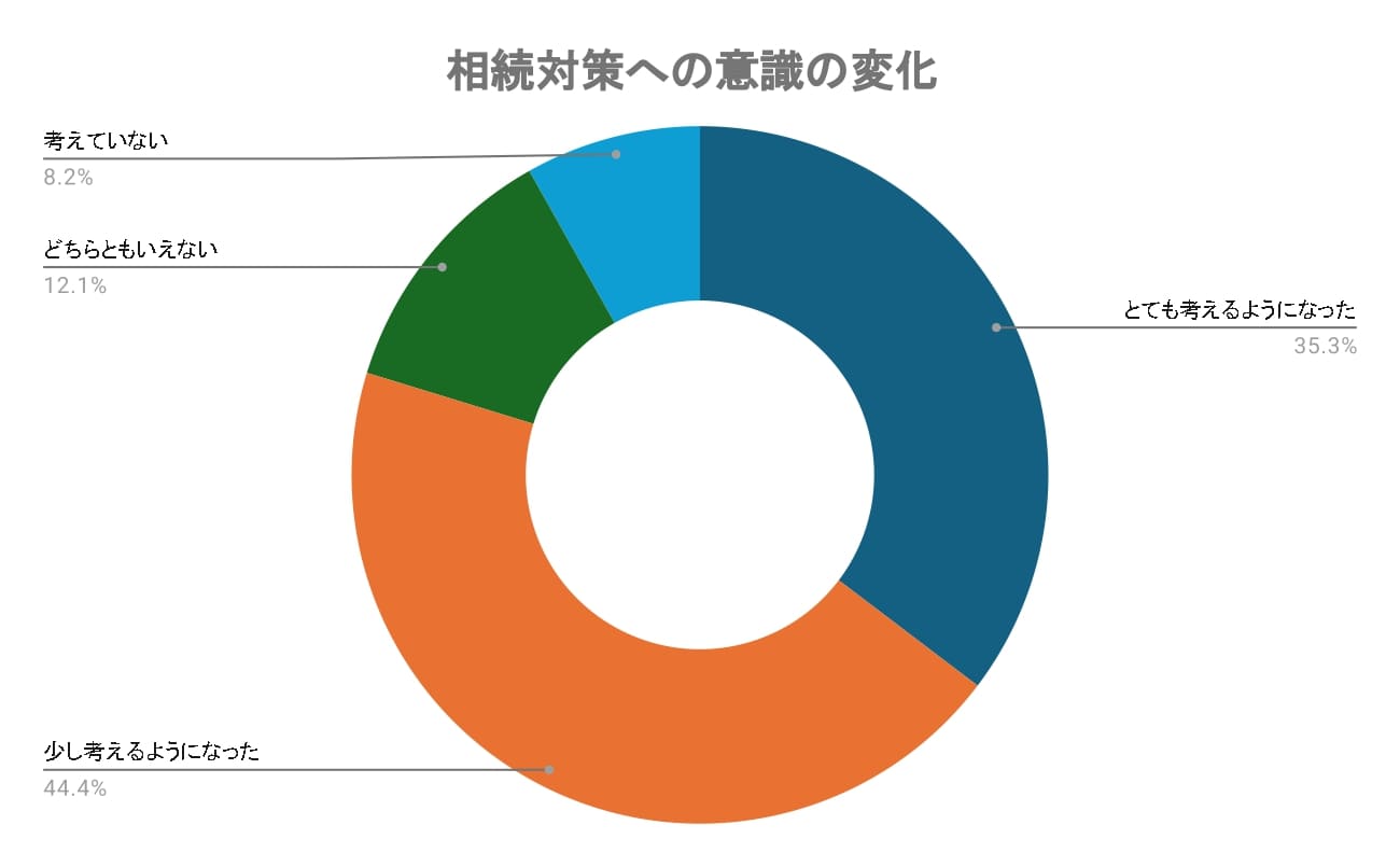 相続手続きを経験したことで「とても考えるようになった」(35.33%)、「少し考えるようになった」(44.40%)と回答した人が合わせて約8割にのぼりました。実際に相続の手続きを経験することで、自分自身の将来の備えについて意識が高まる人が多いことがわかります。