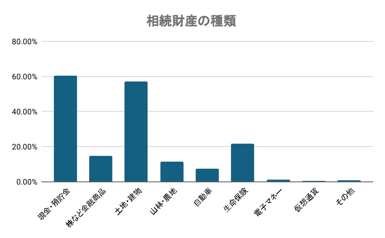 相続財産として最も多く挙げられたのは「現金・預貯金」(60.29%)で、次いで「土地・建物」(57.25%)が続きました。現金や預貯金は分割しやすく、相続人間での調整が比較的容易ですが、土地や建物は分けにくい性質から意見が対立しやすく、相続トラブルの原因となることが少なくありません。