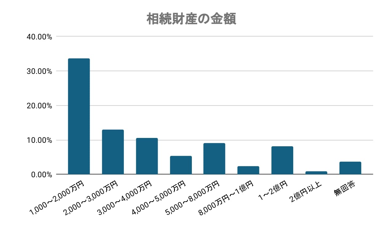 相続財産の金額帯として最も多かったのは「1,000~2,000万円」で33.60%、次いで「1,000万円未満」が13.17%、「2,000~3,000万円」が13.01%と続きました。全体の約6割が3,000万円未満に収まっており、比較的少額な相続が多数派であることがうかがえます。
