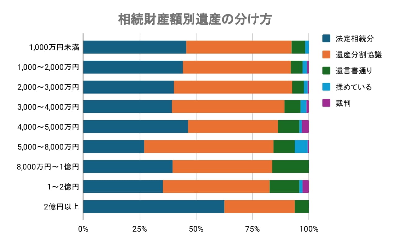 相続財産の金額によって、どのように分けられているかには少しずつ違いが見られます。たとえば「1,000~2,000万円」の層では、「法定相続分」(41.77%)と「遺産分割協議」(45.00%)がほぼ同じくらいで、法律に従って分けるケースと、相続人同士で話し合って決めるケースがバランスよく存在しています。