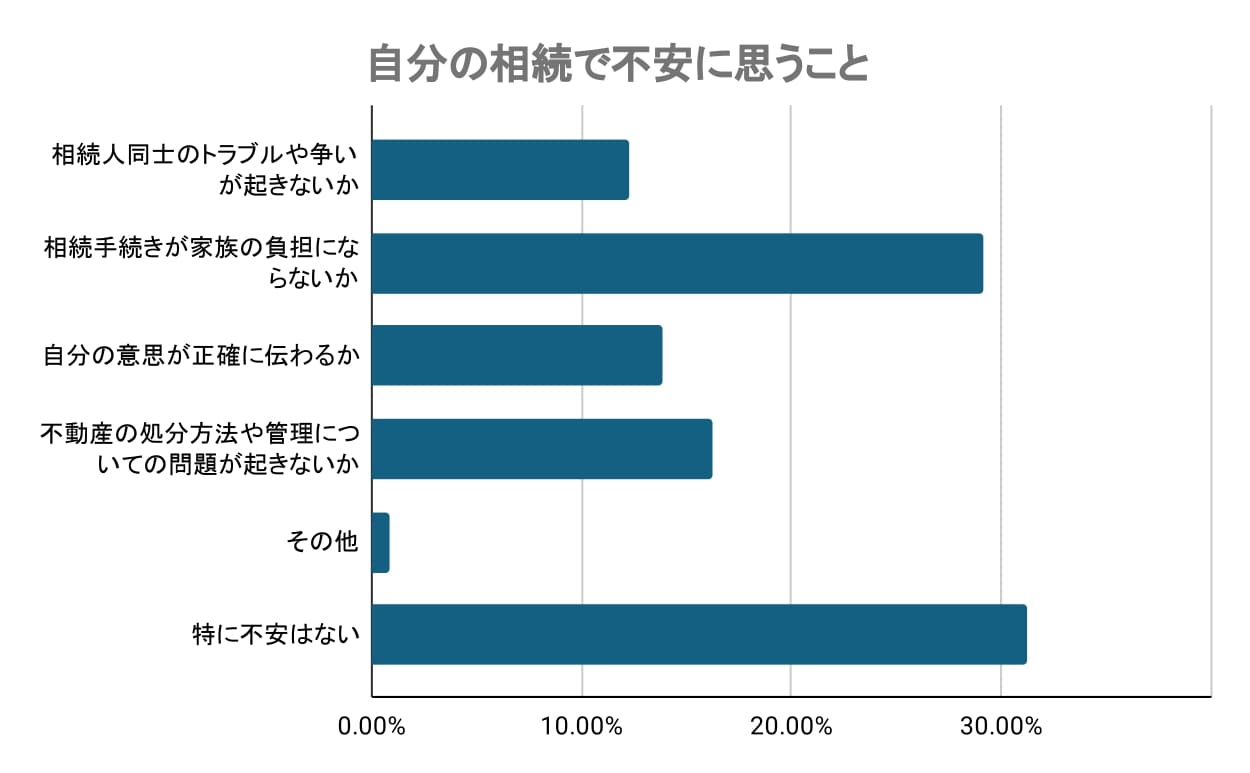 中でも多かったのは「相続手続きが家族の負担にならないか」(29.10%)という不安で、手続きの煩雑さや時間的・精神的な負担を気にする声が目立ちました。また、「不動産の処分方法や管理についての問題が起きないか」(16.22%)、「自分の意思が正確に伝わるか」(13.86%)といった、相続の内容や意志の伝達に関する不安も一定数ありました。