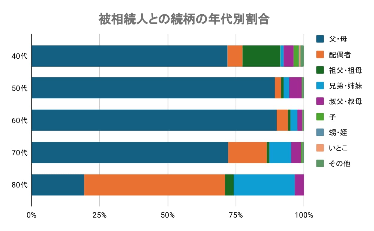 70代では「配偶者」や「兄弟・姉妹」からの相続が増加し、80代になると「配偶者」(51.61%)が最多でした。夫婦間や横の関係の相続が中心となり、被相続人との続柄は、年代ごとに違いがあることがわかります。