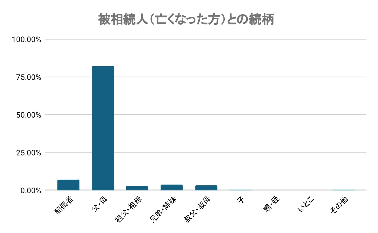 全体で、アンケート回答者と被相続人との続柄で最も多かったのは「父・母」で82.4%と圧倒的多数を占めました。次いで「配偶者」(6.88%)、「兄弟・姉妹」(3.68%)、「叔父・叔母」(3.14%)と続きます。相続の多くが親の死亡によって発生することがわかりました。