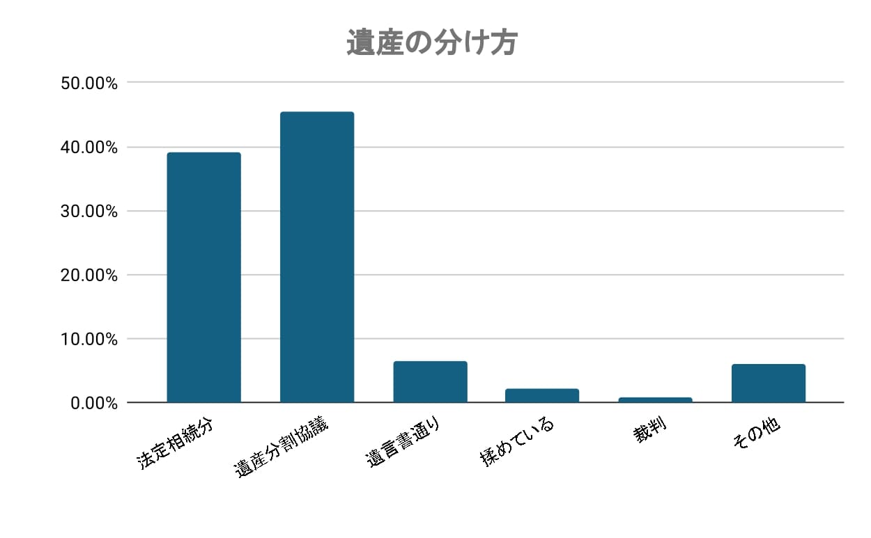 相続財産の分割方法として最も多かったのは「遺産分割協議」(45.50%)で、次いで「法定相続分」(38.99%)が続きました。多くの家庭で、相続人同士が話し合うか、法律で決められた割合に従って財産を分けていることがわかります。「遺言書通り」は6.51%と比較的少いのは遺言書の活用はまだ限定的な状況であることが考えられます。「揉めている」(2.17%)や「裁判になった」(0.87%)といったトラブルのあるケースも一部存在していました。