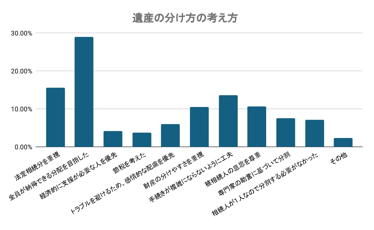 「被相続人の意思を尊重」(10.61%)といった考え方も1割前後あり、故人の思いを重んじる姿勢がうかがえます。