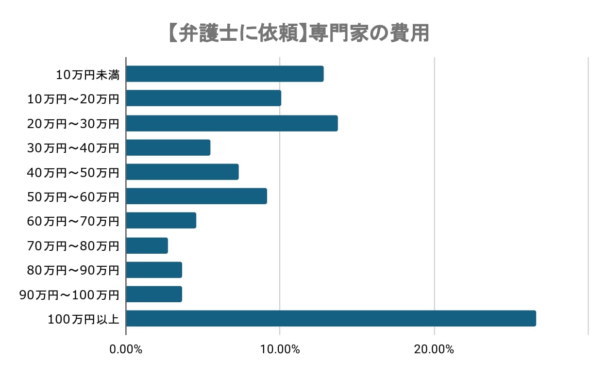 弁護士に依頼した人が専門家に支払った費用で最も多かったのは「100万円以上」(26.61%)でした。他の金額帯と比べて突出した割合となっています。