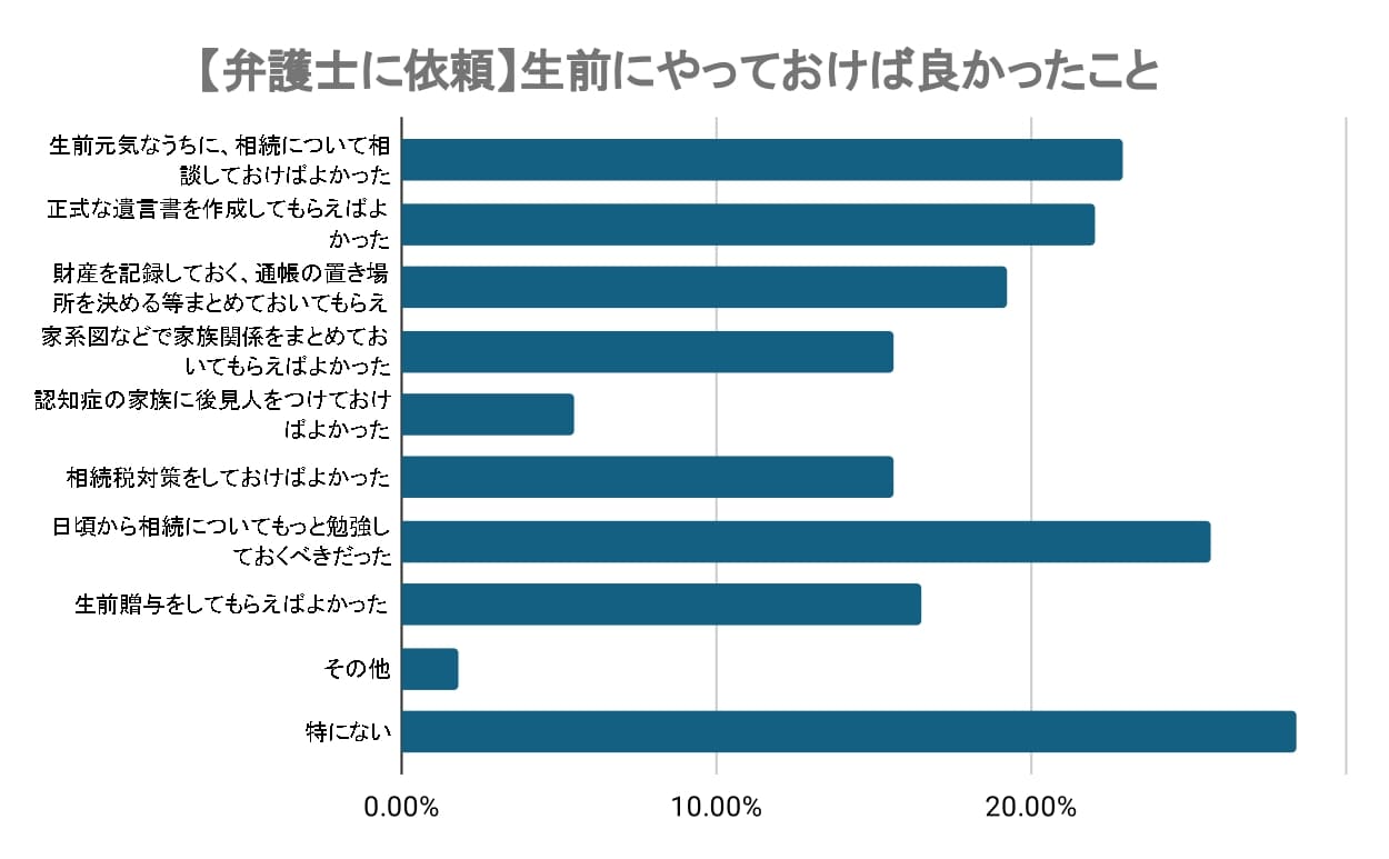 弁護士に依頼した人の相続に関して生前にやっておけばよかったことについては、「日頃から相続についてもっと勉強しておくべきだった」(25.69%)が最も多く、次いで「生前元気なうちに、相続について相談しておけばよかった」(22.94%)、「正式な遺言書を作成してもらえばよかった」(22.02%)が続きました。これらの結果から、相続に関する知識や準備の不足を実感した人が多かったことがうかがえます。