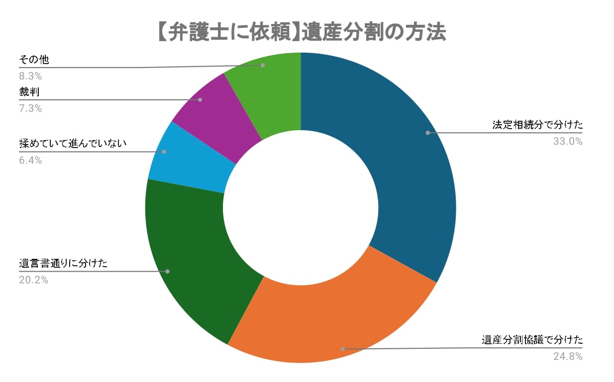 弁護士に依頼した人の中で、最も多かった分割方法は「法定相続分で分けた」(33.0%)でした。次いで「遺産分割協議で分けた」(24.8%)、「遺言書通りに分けた」(20.2%)という結果でした。