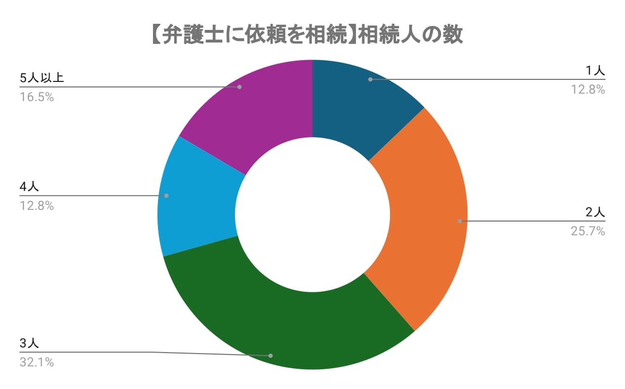 弁護士に依頼したケースでは、相続人が3人(32.11%)という割合が最も高く、全体の約3分の1を占めています。次いで2人(25.69%)、1人(12.84%)の順で続きました。比較的少人数での相続が多い傾向にあります。