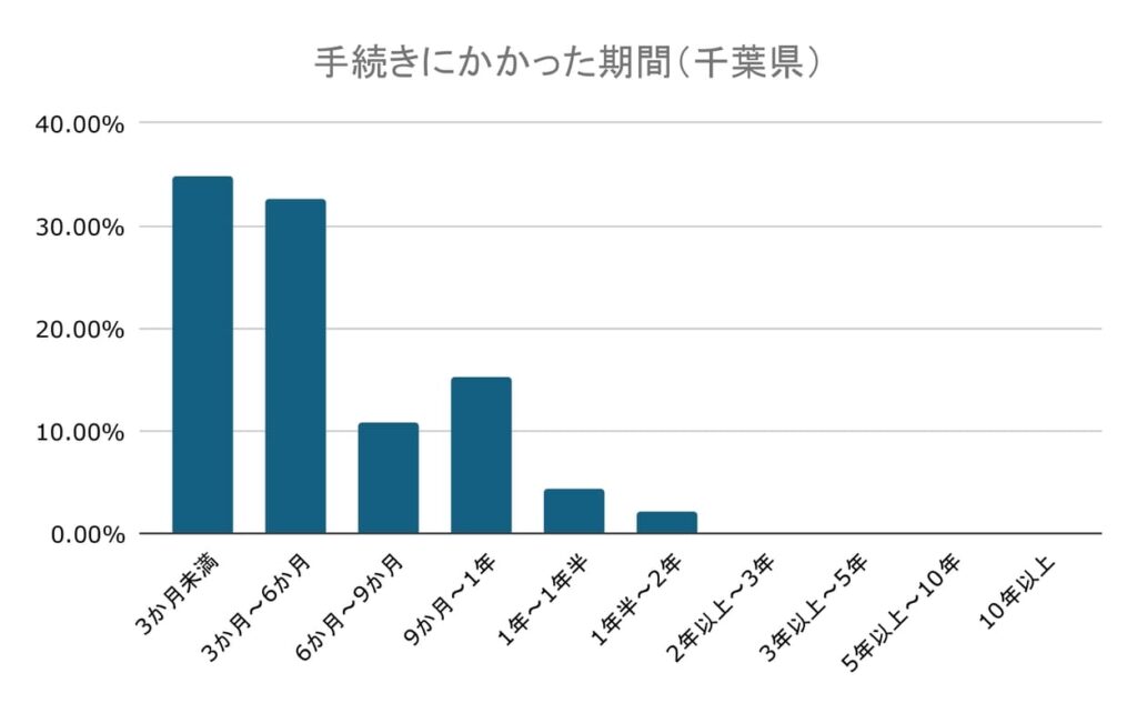 千葉県に住む人の相続手続きにかかった期間は3か月未満が最も多く34.78%でした。次いで3か月~6か月未満が32.61%、6か月~9か月未満が10.87%、9か月~1年未満が15.22%となりました。