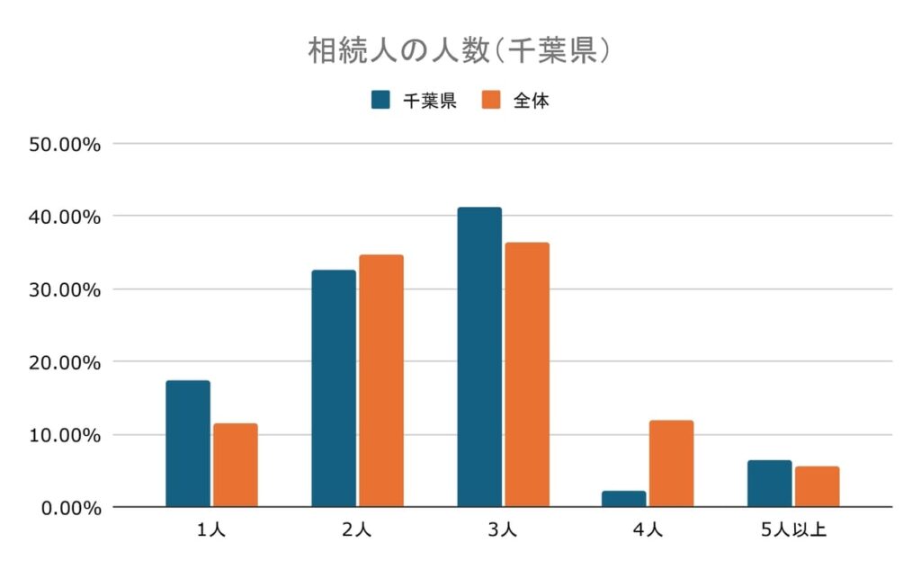 相続人3人と2人をあわせて73.91%と過半数を超えることから、千葉県の相続において相続人は2~3人が一般的だと言えます。ただし、相続人が一人の場合も全体より6%ほど高い結果となりました。
