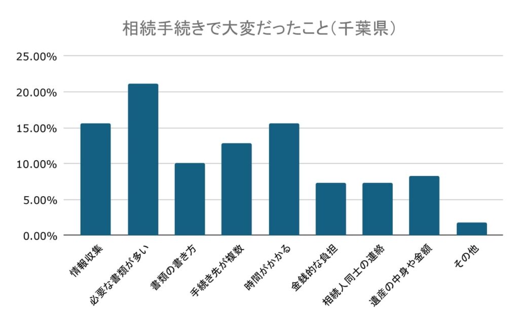 千葉県の相続で大変だったことという質問では、「必要な書類が多い」が21.10%と最多となりました。また「時間がかかる」「情報収集」が同じく15.60%、「手続き先が複数」が12.84%と続きます。