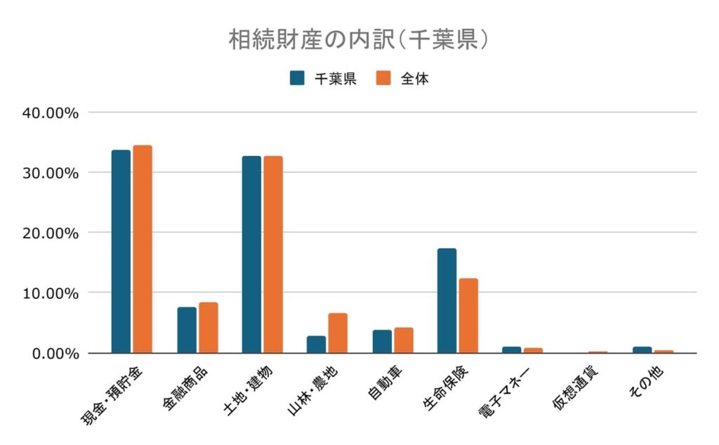 現金・預貯金と土地・建物を相続する人が多く、全体のデータを見ても主要な相続財産であることが読み取れます。千葉県に住む人の相続では、生命保険が相続財産だった人がより多いことがわかりました。