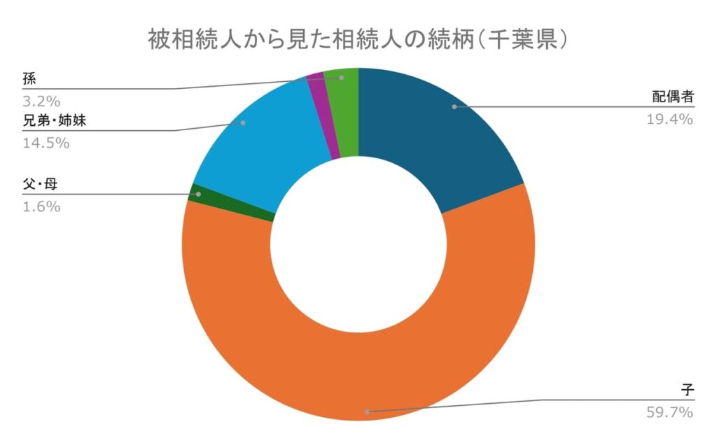 千葉県の相続について、被相続人(亡くなった人)から見た相続人との続柄は、子が他より圧倒的に多く59.68%でした。父母の相続が大多数であることがわかります。