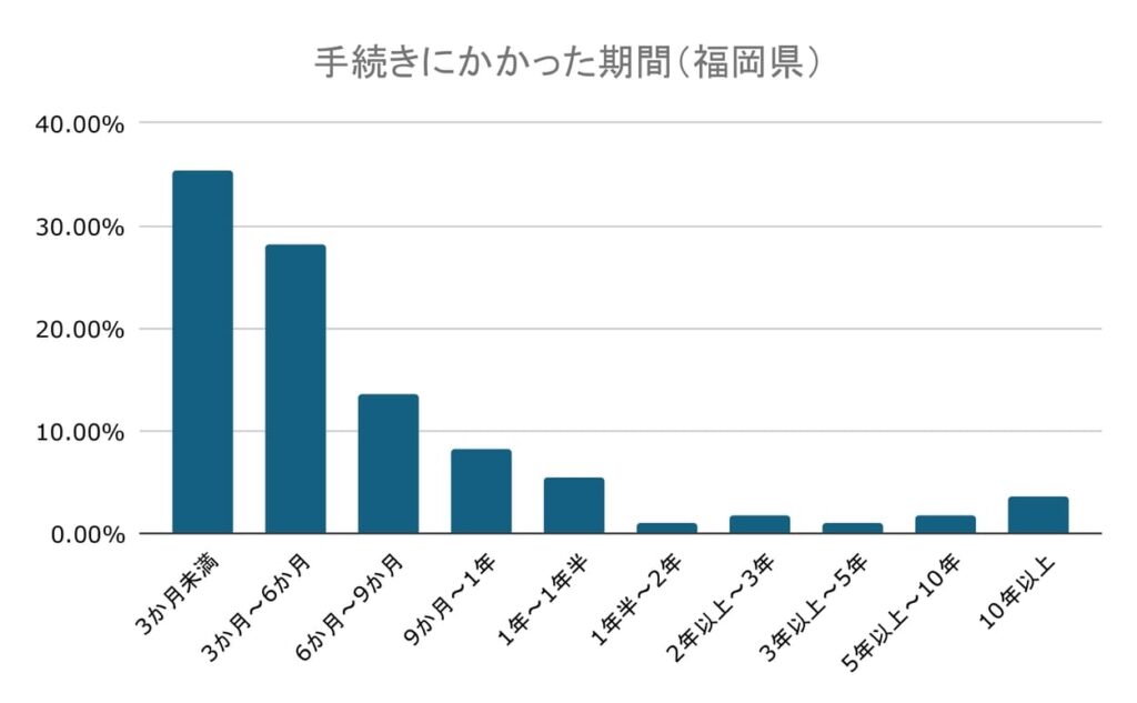 その一方、1年~2年未満が6.36%、2年以上~10年未満があわせて4.55%と、少数ではあるものの手続きが長期間にわたる場合も見られます。10年以上となる場合も3.64%ありました。