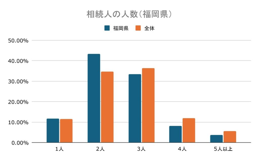 相続人3人と2人をあわせて76.58%と過半数を超えることから、福岡県の相続において相続人は2~3人が一般的だと言え、全体と比較しても特に相続人が4人となる場合が多いようです。
