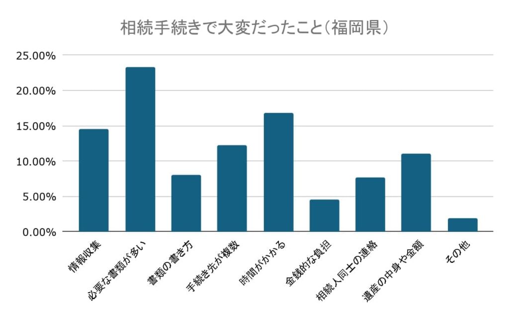 福岡県の相続で大変だったことという質問では、「必要な書類が多い」が23.28%と最多となりました。また「時間がかかる」が16.79%、「情報収集」が14.50%と続きます。「手続き先が複数」は12.21% で、「遺産の中身や金額の確認」も11.07% でした。