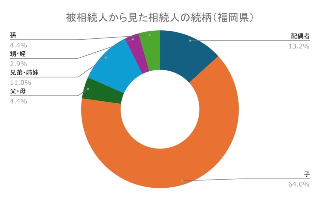 福岡県の相続について、被相続人(亡くなった人)から見た相続人との続柄は、子が他より圧倒的に多く63.97%でした。父母の相続が大多数であることがわかります。