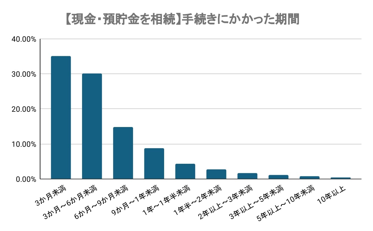 現金・預貯金を相続した人の手続きにかかった期間は、3か月未満(35.02%)、3か月~6か月未満(30.18%)と、合計で 65.2% が半年以内に手続きを終えています。現金・預貯金のみなどの比較的シンプルな相続では、スムーズに進む傾向があると考えられます。6か月~9か月未満(14.80%)、9か月~1年未満(8.75%)と、 相続税の申告期限(10か月以内)を見据えて進めたと思われる人も一定数いるようです。1年以上かかったと答えたのは約11%でした。、相続手続きの期間には個人差が大きいことがわかります。