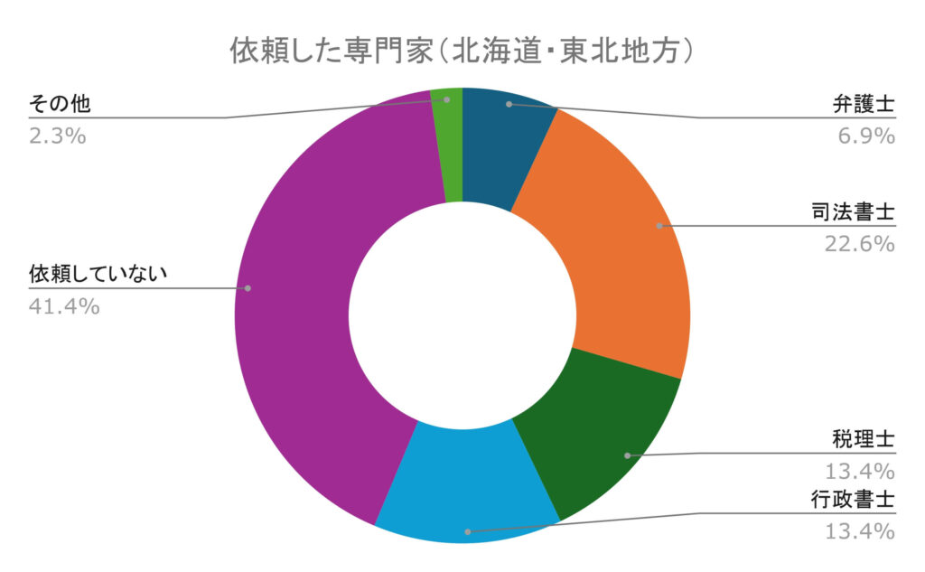 その一方、専門家に依頼していない割合は41.38%でした。したがって北海道・東北に住む人の半分以上が専門家に相続手続きを依頼したと言えます。