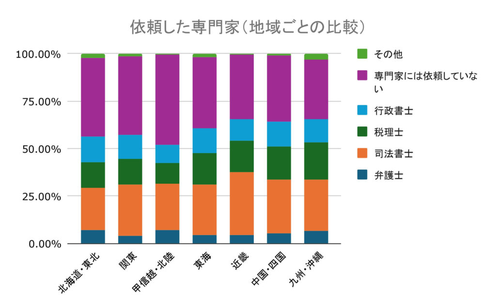 依頼した専門家の地域ごとの比較では、北海道・東北地方の人の相続では司法書士に依頼した割合が他の地域と比べて少ないことがわかります。その代わり、弁護士に依頼した人が他の地域より高いです。