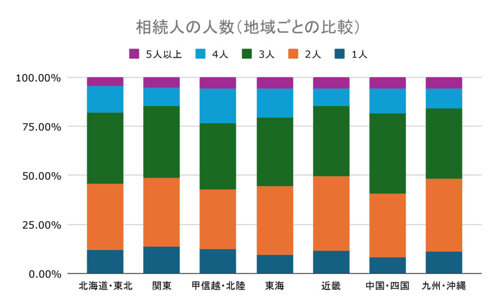 相続人の人数を地域ごとで比較した結果、相続人が5人以上となった割合が最も低く、相続人が1~4人となる相続が95%を超えることがわかりました。これは北海道・東北に住む人の相続の特徴と言えます。