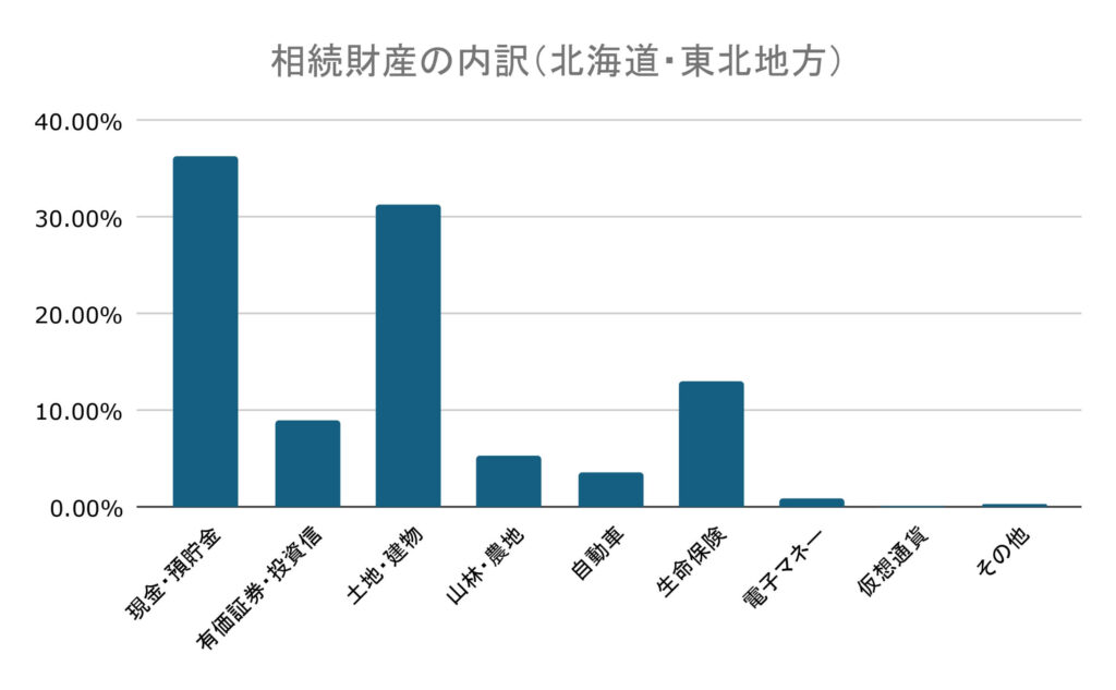 北海道・東北の相続の相続財産内訳は現金・預貯金が36.31%と最多、次いで土地・建物が31.35%でした。